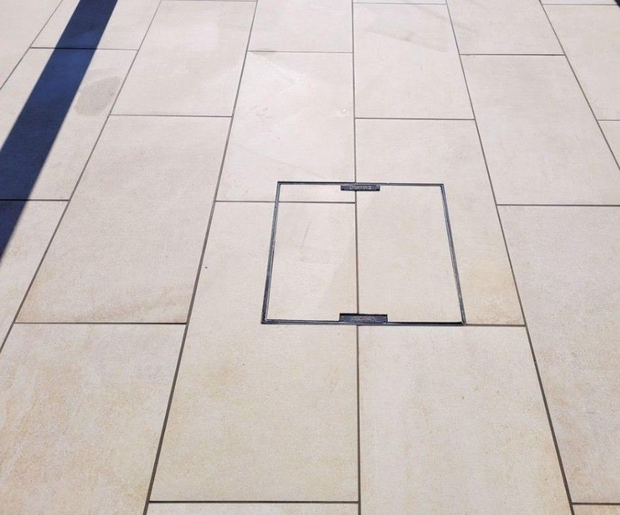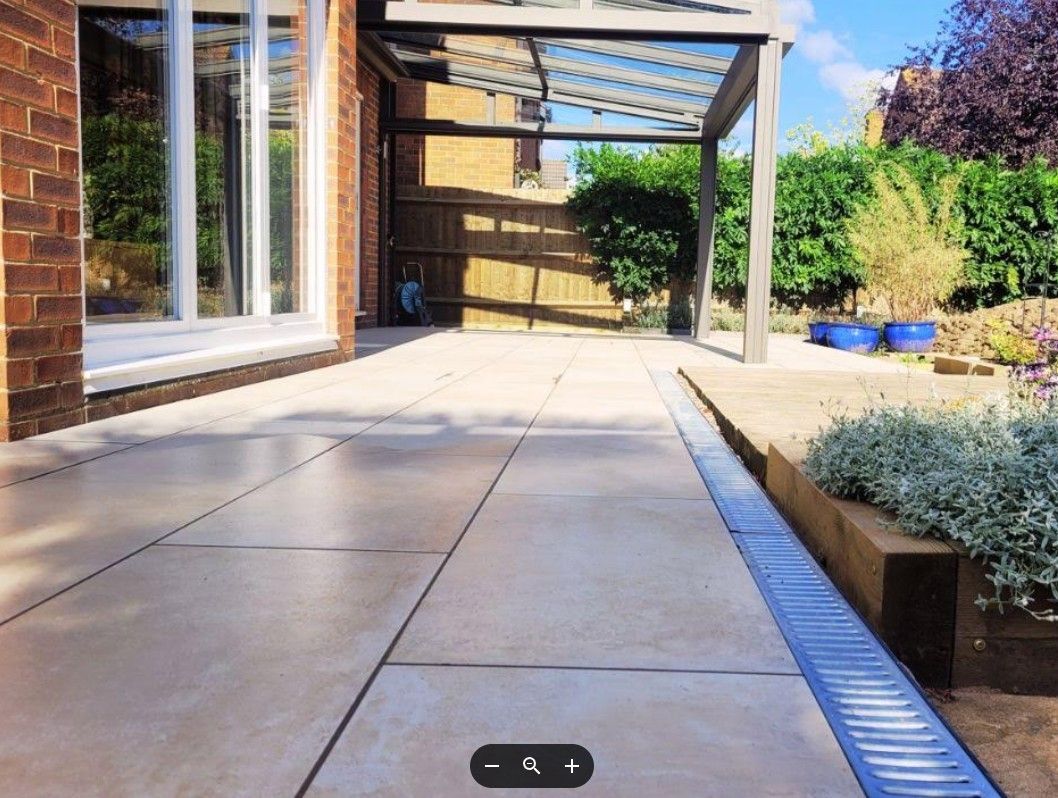 This project features bright and durable Country Crème porcelain paving, creating a sleek, clean surface that enhances the overall garden design and brings a sense of modern elegance