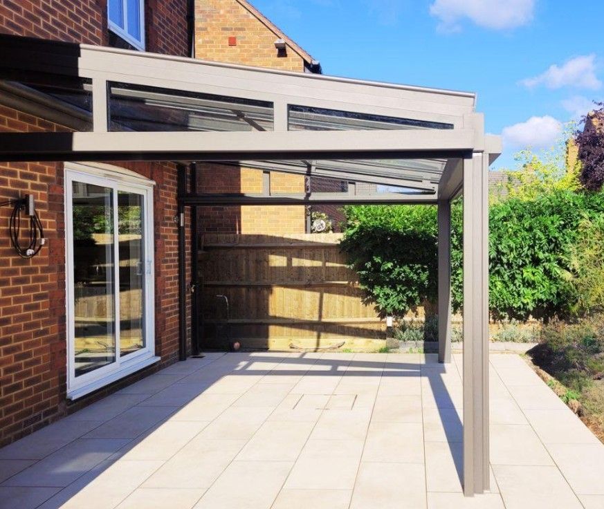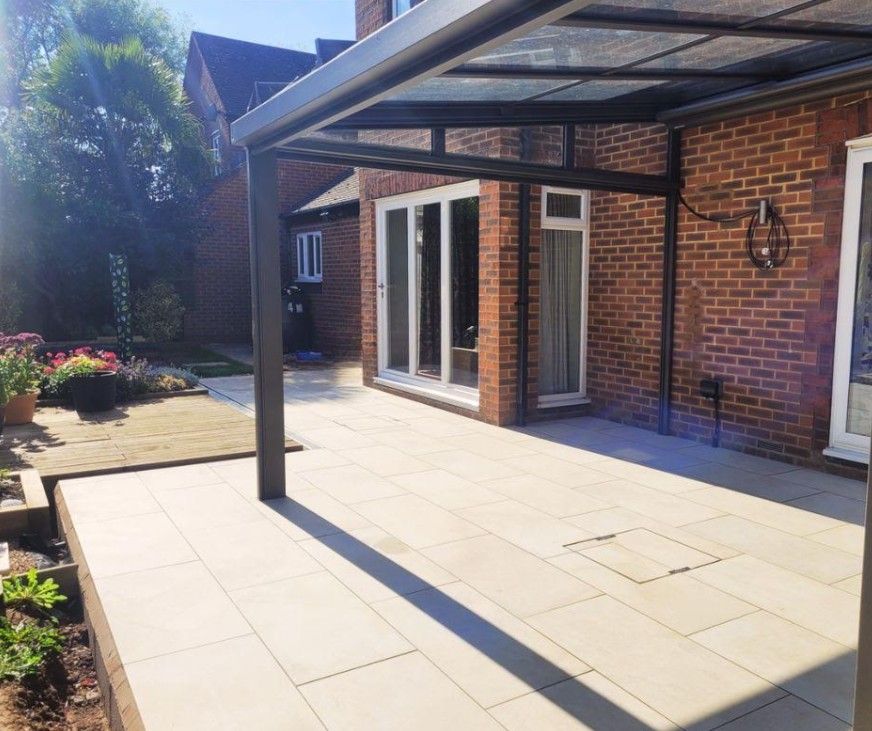 Modern Outdoor Living in Warwick - Country Crème Porcelain Patio & Aluminium Pergola